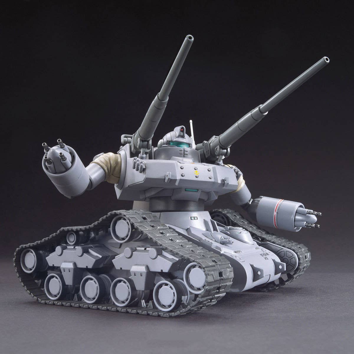 The Guntank from "Gundam The Origin" is more squat and vehicle-like than we're used to seeing. It has movable arms and waist, elevating cannons (with dampers that move with the angle of the turret), and flexible (although non-working) treads. Includes details such as radiator fins and a tank hatch that can be built in an open position. Molded in gray, dark gray, and khaki, with dry-transfer decals for markings.