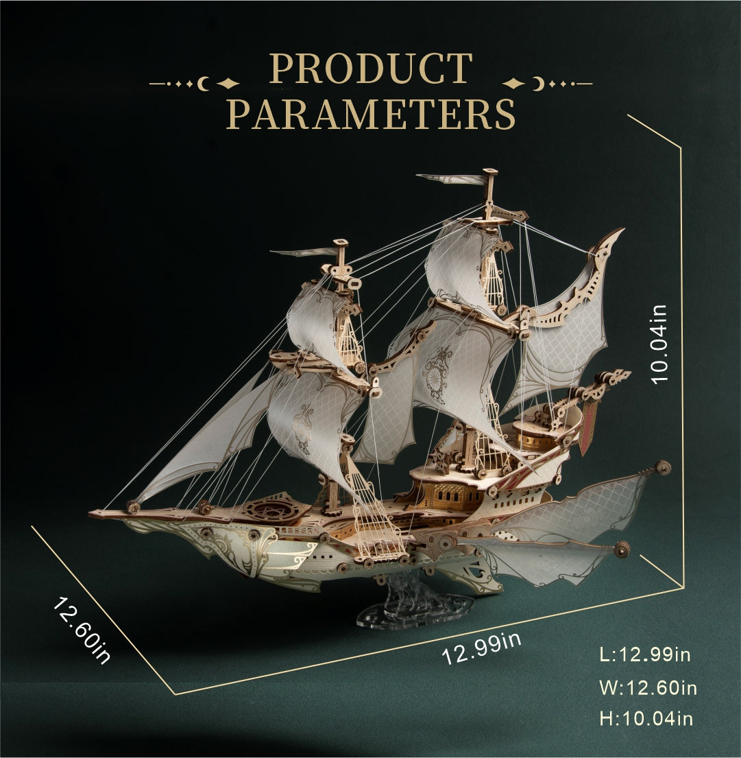 The Fantasy Elfship is a 3D wooden model kit from the Fantasy Airship series, combining Victorian elegance with fantasy-inspired design. It features translucent sails, finely carved details, and a multi-layered deck structure that creates a strong sense of depth while maintaining precise mechanical construction. The sails are made from a specially selected fabric that diffuses light softly, while the traditional mortise-and-tenon framework ensures a stable build and a satisfying assembly experience.