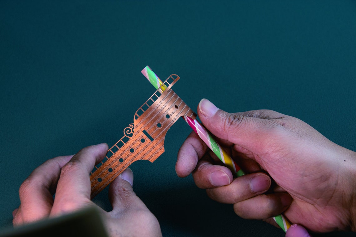 Victorian and steampunk fantasy adventure, the theme of the airship construction: is aft strut, main mast, forward strut, stern, keel, flying flaps, and long forecastle ship, the hull has 4 decks, a pair of flaps propellers, and can carry a flying machine. Double Pitot Tail, Horizontal Tail: The pitot tail is mainly to control yaw and steering, here the design pays homage to the Wright Brothers, adopting a balsa skeleton, canvas skin, and double pitot tail design in the direction of the tail. A thousand colors of short-grain specialty paper were selected to balance light transmission and toughness.