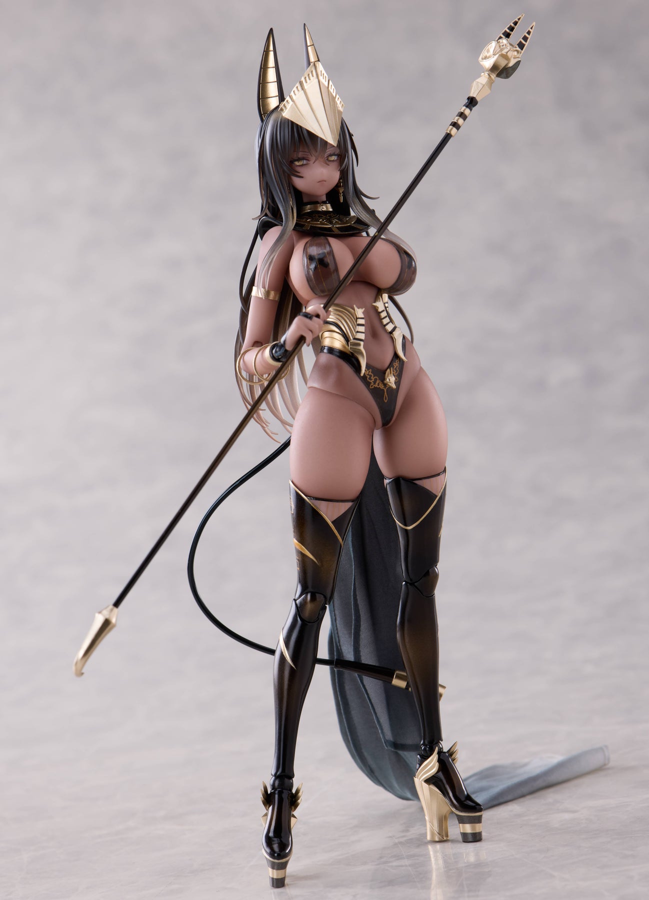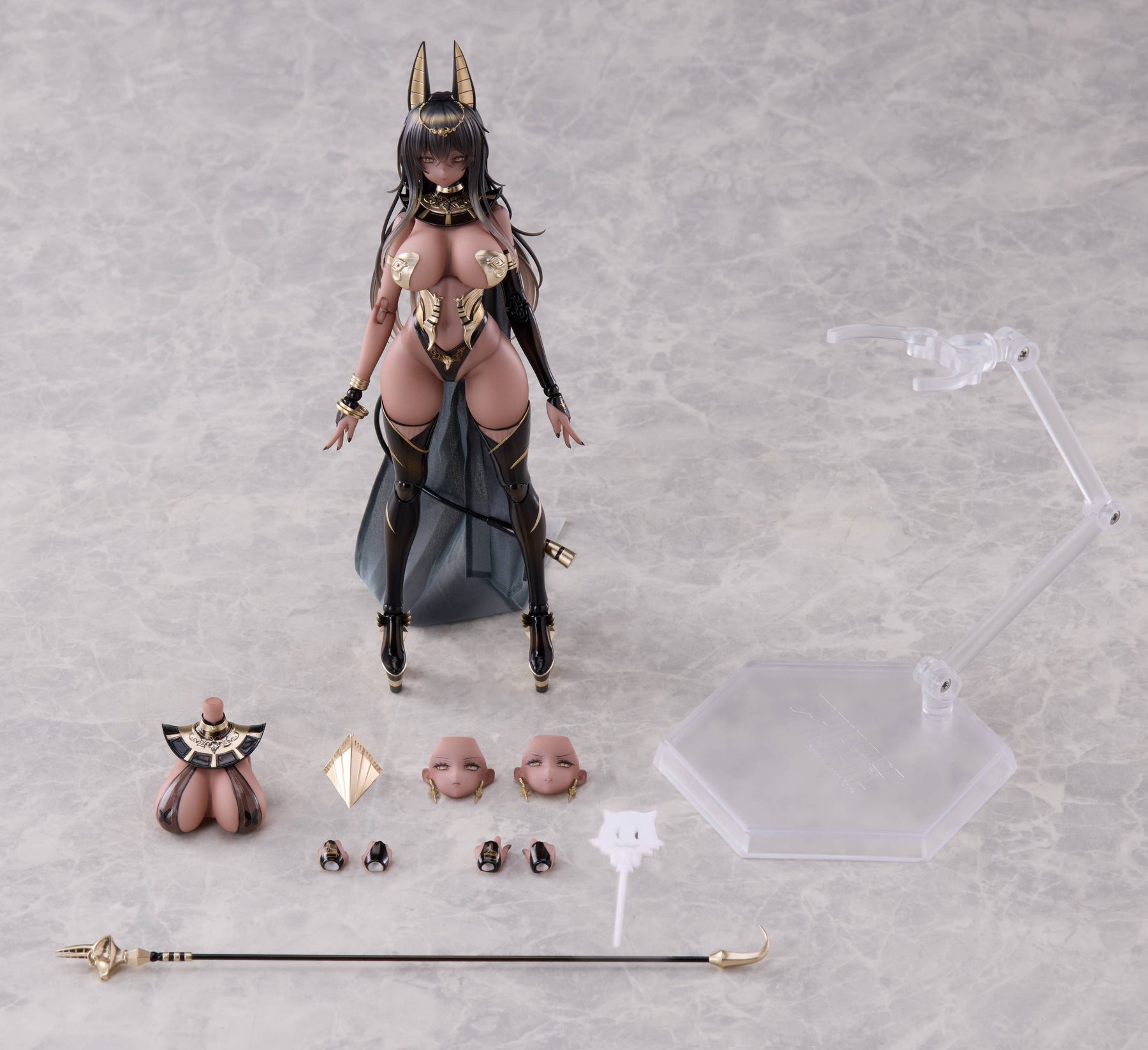 Priestess Shibuna joins the "Galactic" action-figure series from Otherwhere! Based on original artwork by the popular illustrator DISH, this 1/12-scale figure exquisitely captures the alluring temple priestess clad in deepest black and gleaming gold! Her voluptuous body is fully articulated for maximum posability, and a movable eyeball mechanism allows you to change the direction of her gaze. Her paint finish has been meticulously crafted to emphasize the differences in texture between her sculpted metallic bodysuit and her soft skin; a fabric cloak is included too. Interchangeable faces, hands, and her staff weapon allow you to enjoy a wide variety of dynamic poses, and this Deluxe Edition also includes an interchangeable chest part! Order her for your own collection today!
