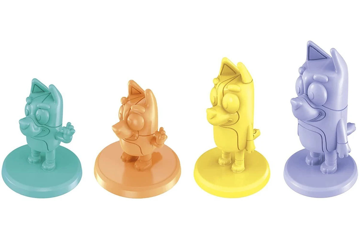 In the Monopoly Junior: Bluey Edition game, players go around the board as Bluey, Bingo, Mum, or Dad.