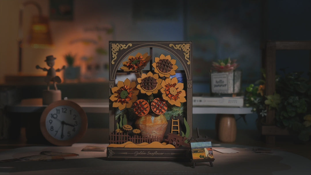 Flowers that never wilt, joy that never fades. Rowood presents an ever-smiling floral arrangement in the Golden Sunflower, a tabletop ornament and night light puzzle with 266 accurate pieces. Let this kit's layered petals, textured leaves, and vibrant aura always give you a reason to smile. Made of choice, sustainable wood and treated with the latest in coloring technology, this DIY shelf decoration is oozing with realism, warmth, and light. It's the perfect desk decoration, ambient light, weekend project, or gift for her who needs a little brightness to their day. There may be cloudy days, but Rowood will always give you sunshine to build.