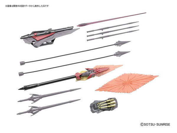 Detailed gimmicks have been recreated based on the Actuator and other mechanisms used on the actual mobile suit. Amatsu Mina's extensive weaponry has also been replicated with superb detailing. The spear-shaped weapon, Okitsu no Kagami, used for both offense and defense, is crafted utilizing solid and clear parts for the first time in the 1/144 scale.