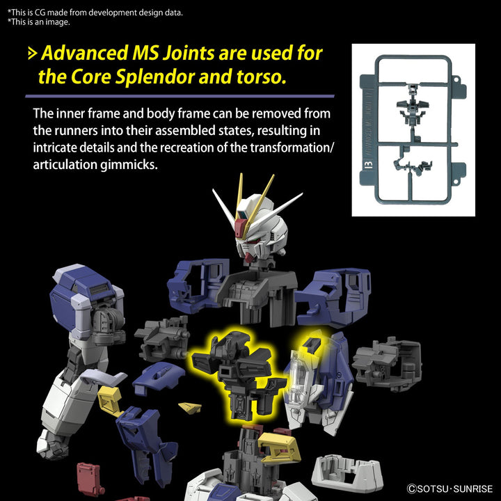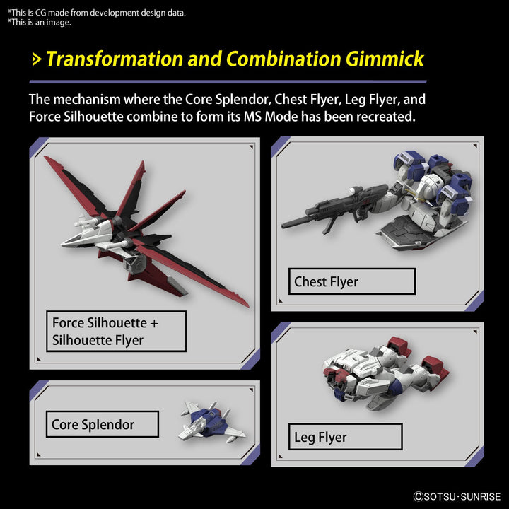 The mechanism that becomes the MS form by combining the Core Splendor, Chest Flyer, Leg Flyer and Force Silhouette is included. An advanced MS joint with insert molding is applied to the Core Splendor and fuselage. The internal frame and body frame can be separated from the runner already assembled, which allows for precise details and movable gimmicks. The color reproduction has been improved by dividing the parts, with even the minute differences between adjacent armor parts precisely expressed. The wings can be folded backwards, and the forearms can be twisted on a separate axis from the elbows. The shoulder armor rotates independently to reduce parts interference. The waist parts move block by block to ensure a wide range of motion. The knee armor moves in conjunction with the legs. Four types of hands for each side are included, as well as a beam rifle, shield, knife and beam saber. New realistic decals are included as well.