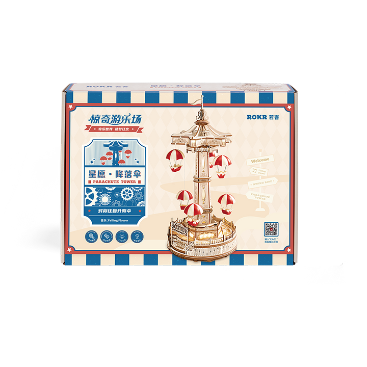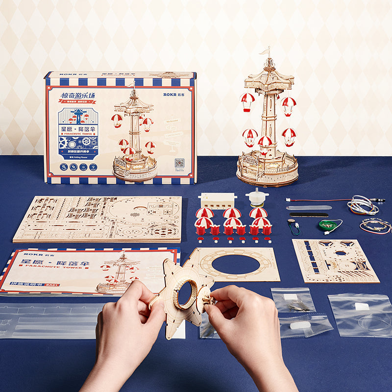 ROKR Parachute Tower EA01 is a DIY music box 3D wooden puzzle kit of the Magic Amusement Park Series. The designer takes the classic parachute tower ride in the real amusement park as the design prototype and modifies it, making the reciprocal lifting parachute staggered ups and downs, which is more creative and fun.